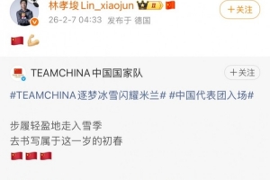 中国短道速滑运动员林孝埈在社媒转发了中国代表团现身开幕式的照片,并配上了“🇨🇳💪”的emoji。