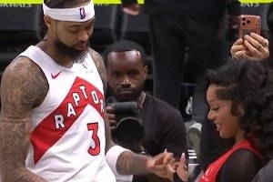 赛后,英格拉姆在场边和歌手女友格洛丽亚在场边秀恩爱。
