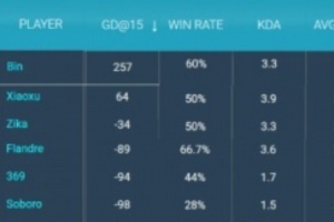 体育资讯2月13日讯 外网数据网站统计LPL第一赛段常规赛登峰组上单数据:前15经济差Bin第一257。