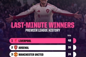 以下为英超历史球队在90分钟后打进绝杀次数榜,具体如下: