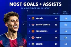 体育资讯2月24日讯 《转会市场》统计了本赛季五大联赛中场球员在各项赛事直接参与进球情况,费尔明领跑。