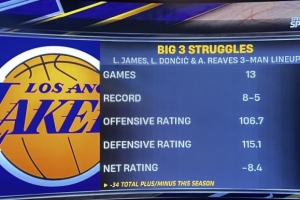 湖人客场挑战太阳,赛前转播方给出本赛季至今东契奇、詹姆斯和里夫斯在场时的数据: