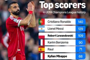 体育资讯03月19日讯 本赛季欧冠1/8决赛全部结束,外媒统计了欧冠历史射手榜,C罗140球位居榜首,梅西、莱万分列二三。萨拉赫、凯恩均达成各自的欧冠生涯50球,跻身榜单前十。