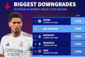1-罗德里(曼城),下降4500万欧,当前身价4500万欧