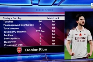 体育资讯11月2日讯 英超第10轮比赛,赖斯破门,阿森纳客场2-0击败伯恩利,据BBC统计,此役赖斯触球、抢断、拦截等多项数据全场居首。
