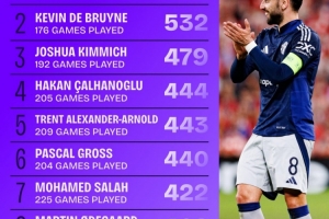 B费在英超已2次单赛季参与进球25+,同期中前卫仅德布劳内做到1次