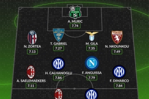 中场:萨勒马科尔斯(米兰)、恰尔汗奥卢(国米)、安古伊萨(那不勒斯)、迪马尔科(国米)