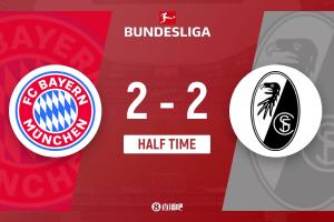 上半场伤停补时3分钟,半场结束,拜仁暂2-2弗赖堡。