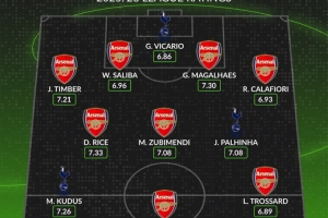 体育资讯11月23日讯 在北伦敦德比开战之前,著名数据网站WhoScored评选出了两队合体评分最高阵,阿森纳8人,热刺3人入选,约克雷斯、赖斯、苏维门迪、加布里埃尔、萨利巴系数入选。