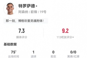 体育资讯11月24日讯 阿森纳在本轮英超4-1领先热刺,特罗萨德本场数据如下: