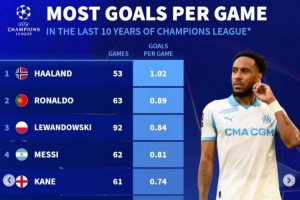 体育资讯11月26日讯 马赛在本轮欧冠2-1逆转纽卡斯尔,奥巴梅扬梅开二度。《转会市场》统计显示,他也是近10年欧冠场均进球榜前十。