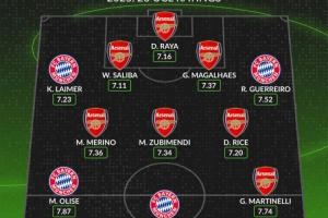 体育资讯11月27日讯 拜仁将在本轮欧冠客战阿森纳,whoscored也列出了两队本赛季欧冠评分合体最佳阵,阿森纳7将在列。