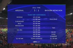两队平均 阿森纳11.43km 拜仁11.33km
