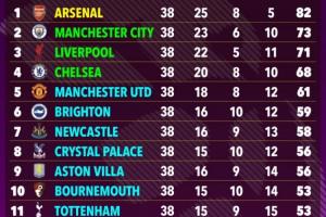 1-阿森纳 82分 25胜8平5负