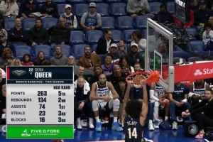 转播方给出了一组新秀数据,首轮13号秀奎因本赛季总得分(第五)、篮板(第二)、助攻(第一)、抢断(第三)和盖帽(第三)皆在2025届新秀前五。