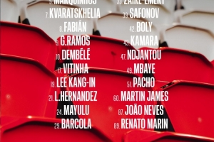 前锋:7-克瓦拉茨赫利亚、9-贡萨洛·拉莫斯、10-登贝莱、19-李刚仁、29-巴尔科拉、47-恩贾恩图、49-姆巴耶
