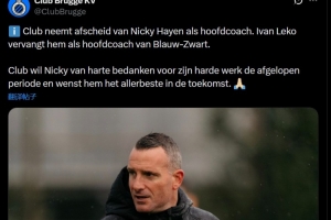 布鲁日官方写道:“布鲁日俱乐部宣布尼基·海恩卸任主教练一职,伊万·莱科将接替他担任主教练。”