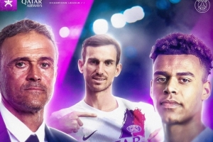 巴黎官方社媒晒出此役的赛前海报,主帅恩里克携法比安、杜埃出镜。