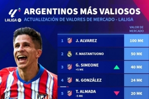 体育资讯12月13日讯 德国转会市场更新了西甲球员的身价,并列出西甲阿根廷球员身价排名,阿尔瓦雷斯1亿欧居首,马斯坦托诺5000万欧次席。