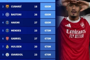 6、加布里埃尔(阿森纳,27岁):7500万欧