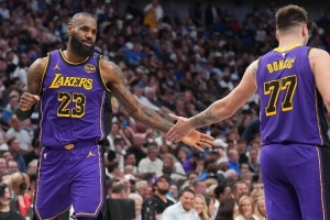 詹姆斯出战的比赛,东契奇场均36.2分8.3板9.6助攻,真实命中率61%,胜率77.8%(7胜2负);