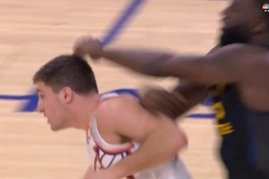 这不看回放?三球用手扒阿德巴约脚后跟致其倒地受伤 已回更衣室