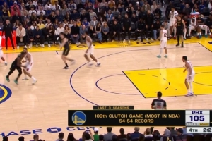 比赛第四节双方双方比分紧咬,转播方晒出一组数据:勇士近3个赛季打了109场胶着比赛(含本场),为联盟最多!