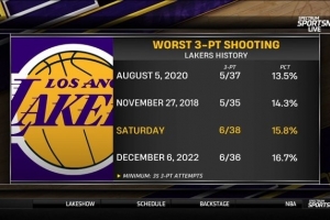 本场比赛湖人三分38中6,命中率15.8%,在队史超过35次出手的比赛里,命中率排名第三低。