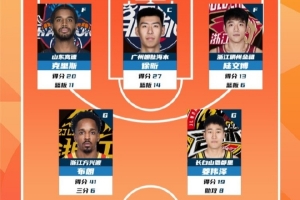 2025-2026赛季CBA联赛常规赛第4轮结束较量,来自山东高速篮球俱乐部的克里斯,龙狮篮球俱乐部的徐昕,浙江稠州篮球俱乐部的陆文博,浙江广厦篮球俱乐部的布朗和吉林东北虎男篮的姜伟泽入选CBA联赛常规赛第4轮最佳阵容!