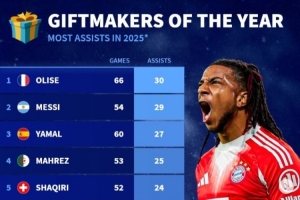体育资讯12月25日讯 德转官方社媒列出2025年度足坛助攻榜,拜仁球员奥利塞以66场30次助攻居首,迈阿密国际球员梅西54场29次第二。