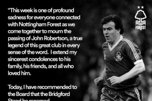 体育资讯12月27日讯 诺丁汉森林传奇球星约翰·罗伯逊去世,他曾帮助球队两次夺得冠军杯(欧冠前身)。对于这样一名在俱乐部历史上举足轻重的人物,诺丁汉森林老板马里纳基斯提出了一个缅怀约翰·罗伯逊的方案。