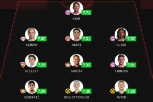 前卫:哈维·西蒙斯(莱比锡,7.52分)、阿米里(美因茨,7.31分)、奥利塞(拜仁,7.92分)