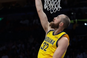 本场比赛,步行者中锋赫夫发挥不错,进攻端里突外投很高效,但最后时刻不在场上。