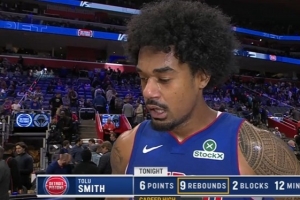 上半场,活塞双向合同球员托卢·史密斯表现出色,篮板已经刷新生涯新高(此前7个),替补出战12分钟,投篮4中1,罚球4中4,拿到6分9篮板(4前场篮板)2抢断2盖帽的数据。