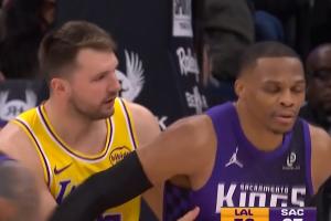 GIF-东契奇回身撞到威少 轻拍后者友好示意