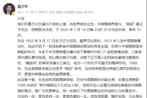 我们怀着万分沉痛与不舍的心情,向各界亲友泣告:中国围棋界泰斗、“棋圣” 聂卫平先生,因病医治无效,于 2026 年 1 月 14 日晚 22时 55分与世长辞,享年 73 岁。