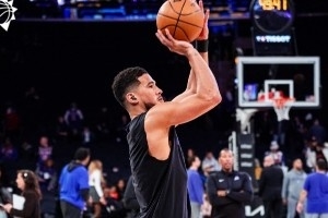 体育资讯1月18日讯 今天太阳客场对阵尼克斯,布克也特地选择了一双和纽约有着关联的一个配色。