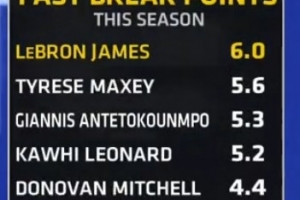 湖人VS开拓者,转播方晒出本赛季快攻场均得分前五: