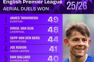本赛季英超空中成功对抗榜: