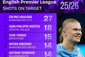 本赛季英超射正榜: