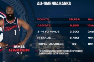 快船战胜爵士,转播方晒出哈登数据 :