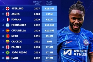 体育资讯1月29日讯 德转统计切尔西队内的年薪排行,刚刚官宣离队的斯特林此前年薪1950万欧排名队内第一,里斯·詹姆斯、福法纳排名前三。